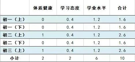 过程性考核通过每学期的4个体育项目考核和出勤情况综合计算分数。除了初三下学年以外共5个学期,每学期2分,共计10分。