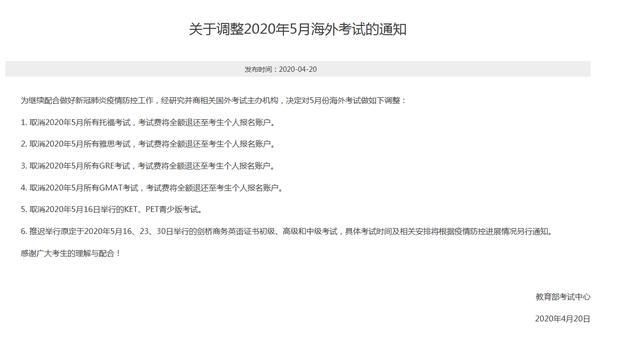 《关于调整2020年5月海外考试的通知》