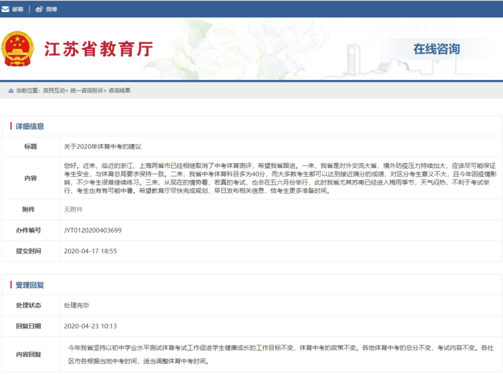 您好。近来,临近的浙江、上海两省市已经相继取消了中考体育测评,希望我省跟进。一来,我省是对外交流大省,境外防疫压力持续加大,应该尽可能保证考生安全,与体育总局要求保持一致。二来,我省中考体育科目多为40分,而大多数考生都可以达到接近满分的成绩,对区分考生意义不大,且今年因疫情影响,不少考生很难继续练习。三来,从现在的情势看,若真的考试,也会在五六月份举行,此时我省尤其苏南已经进入梅雨季节,天气闷热,不利于考试举行,考生也有有可能中暑。希望教育厅尽快完成规划,早日发布相关信息,给考生更多准备时间。