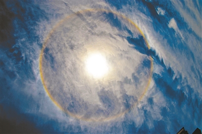 对于北京上空出现的日晕,林文实教授解释,“它的成因与七彩云类似,但日晕是卷层云造成的,所以通常日晕的面积很大,很均匀,呈现出圆圈状。”