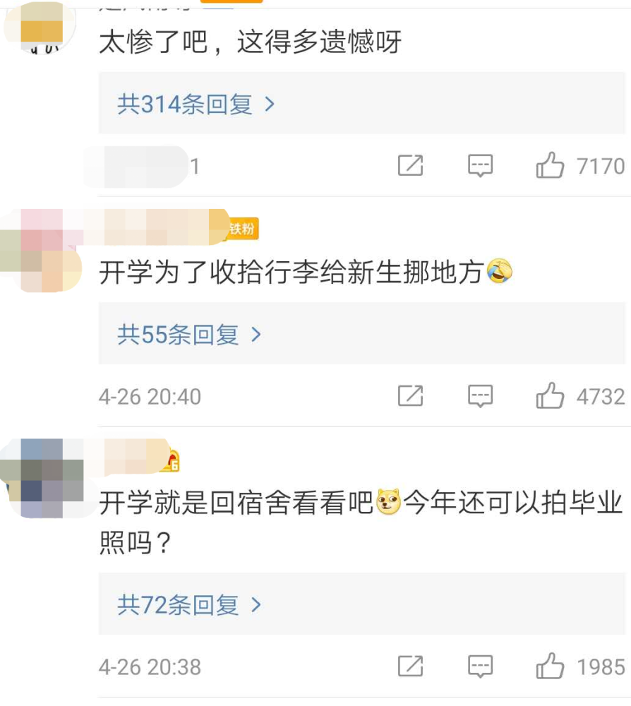 春暖花开,欢迎回来,没想到却是短暂的回归之后的离别。不少网友纷纷表示真的很遗憾,没有毕业照,没有硕士服,没有了最后半年的大学生活。
