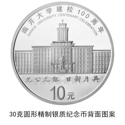 30克圆形银质纪念币背面图案为南开大学主楼、校训及校钟装饰纹样等组合设计,并刊“南开大学建校100周年”中文字样、“NANKAI UNIVERSITY CENTENARY CELEBRATION”英文字样及面额。