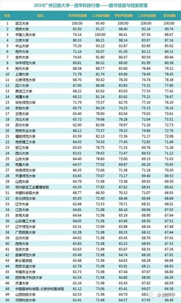 “国内高水平学科(前50)”:评估的全国590所院校中有219所的人文社会学科一级学科进入“国内高水平学科(前50)”,其中浙江大学、北京师范大学、吉林大学和南京大学各有19个,北京大学、清华大学、中国人民大学、武汉大学和中山大学各有18个,南开大学、山东大学、华东师范大学和四川大学各有17个。在人文社科的20个一级学科中,中国人民大学有11个排在第一位,分别是:哲学、理论经济学、应用经济学、法学、政治学、社会学、马克思主义理论、新闻传播学、工商管理、农业经济管理、公共管理;北京大学有4个排在第一位,分别是:中国语言文学、考古学、中国史、世界史;北京师范大学、武汉大学、北京外国语大学、中央民族大学和北京体育大学各有1个排在第一位。