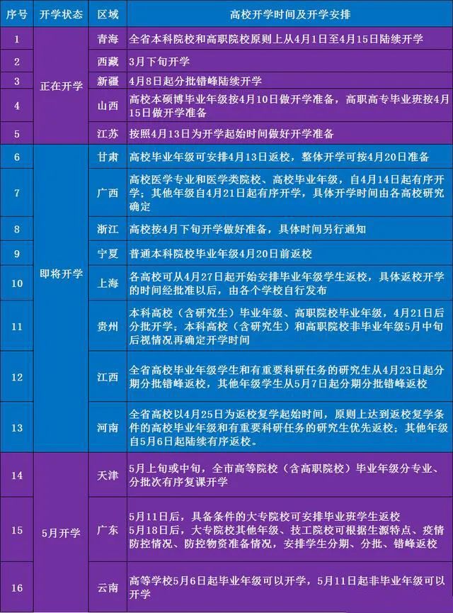 事实上,河南并不是第一个明确高校开学时间的地区,在此之前,已经有15个省市区敲定了高校开学时间,分别是: