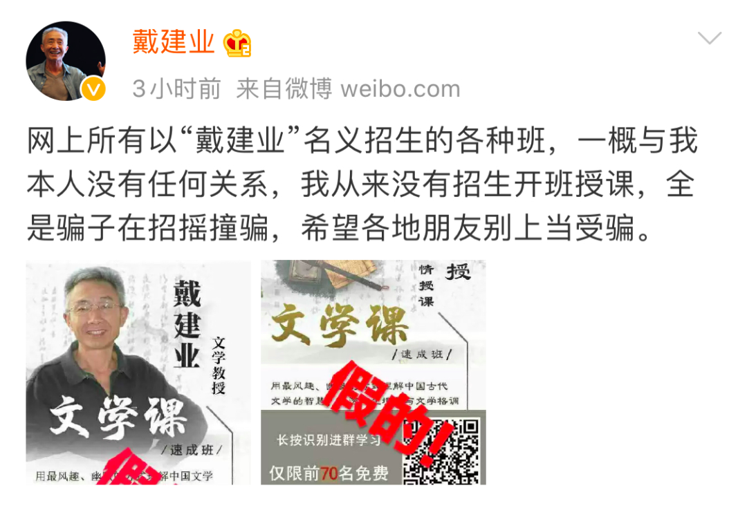4月27日下午,戴建业在朋友圈发布状态称,网上所有以“戴建业”名义招生的各种班,一概与其本人没有任何关系。“我从来没有招生开班授课,全是骗子在招摇撞骗,希望各地朋友别上当受骗。”戴建业说。