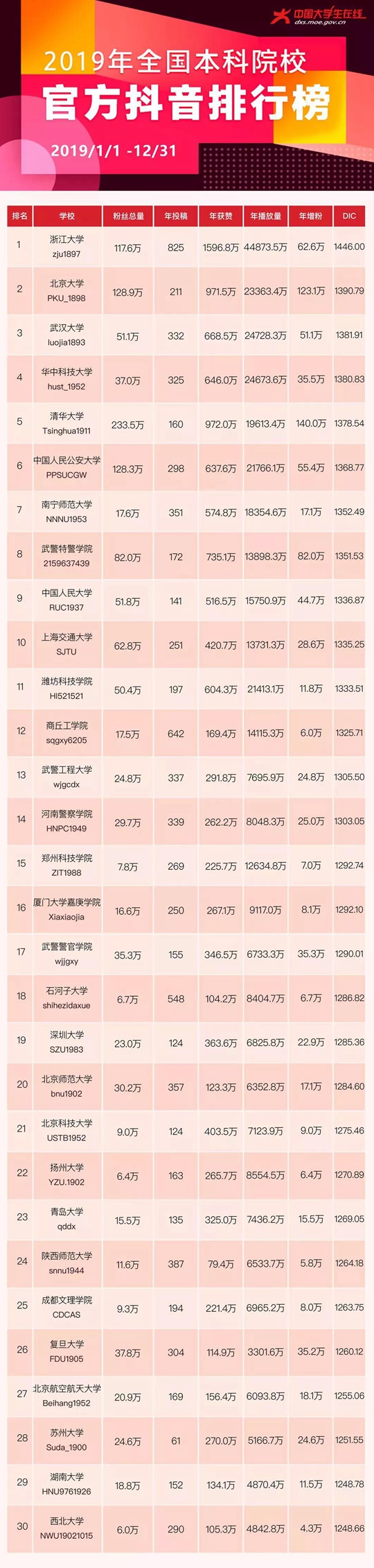 “中国大学生在线”网站是由国家教育部主导并推动,全国大学生参与,全国高校合作共建的公益性、综合性大学生网站。据介绍,该网站综合投稿量、播放量、点赞量、评论量、分享数、增粉数等多个维度,对高校及高校短视频进行推选,发布“2019年全国本科院校官方抖音排行榜(30所高校),同时发布的还有“2019年全国职业院校官方抖音排行榜(30所高职院校)、“2019年全国高校短视频传播力top排行榜”(30件短视频)、“2019年全国高校短视频单项奖”等多个奖项。