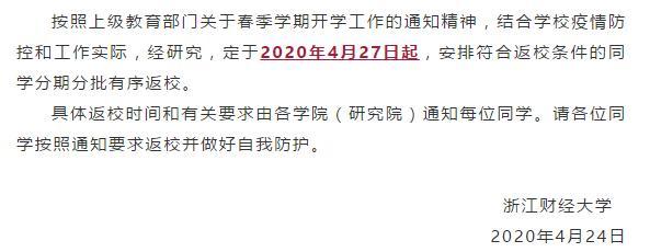 定于2020年4月27日起安排学生分期分批有序返校,具体返校时间和有关要求由各学院通知每位学生。