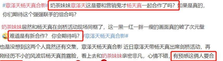 随后,网曝一组“奶茶妹妹”章泽天和杨天真的合影,难道是有合作吗?