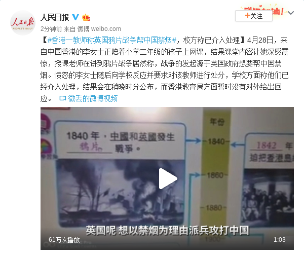 原标题:香港一教师称英国鸦片战争帮中国禁烟,校方称已介入处理