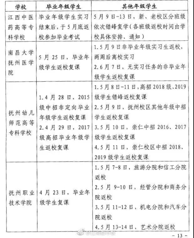 4月28日,江西应用科技学院、江西应用技术职业学院、江西中医药高等专科学校、南昌大学抚州医学院、抚州幼儿师范高等专科学校、抚州职业技术学院6所高校公布了2020年春季学期学生返校复课时间安排。