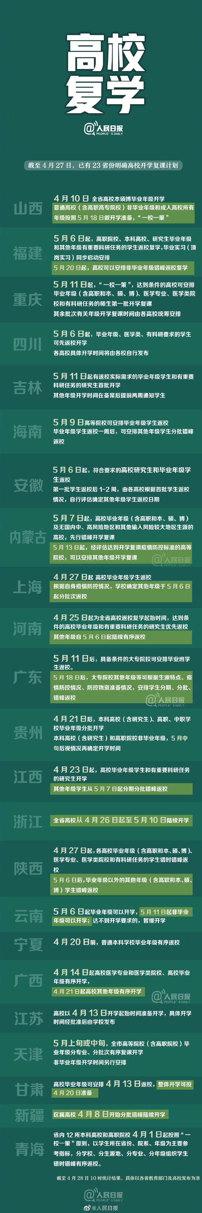 2020全国高校春季开学时间汇总