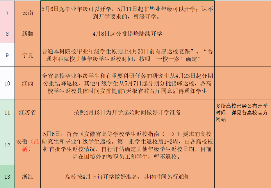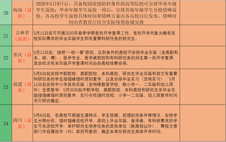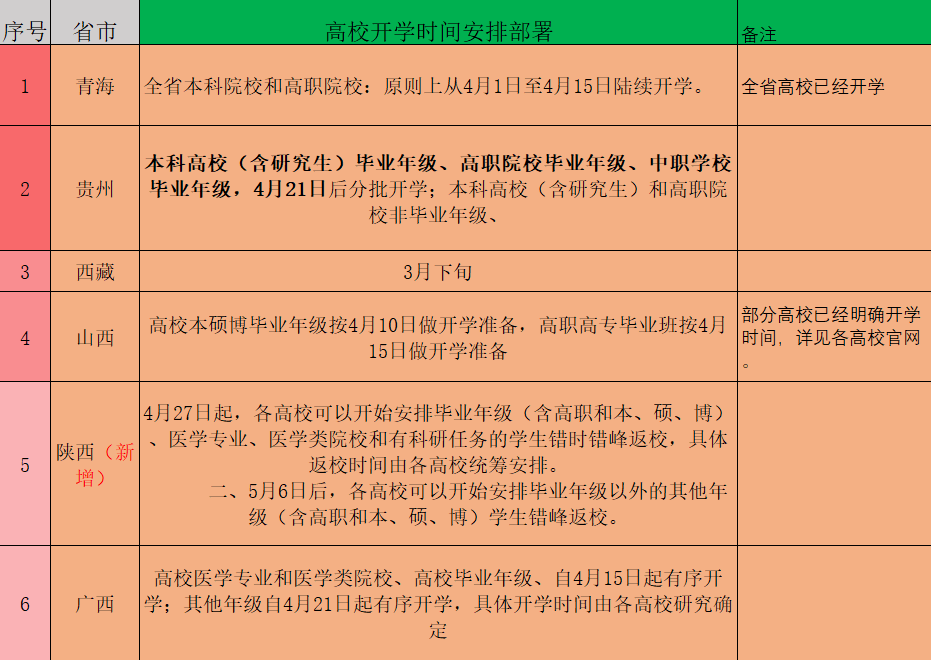 随着我国疫情防控持续向好,全国31省市(不含港澳台)高三、初三开学时间已经明确,而且现在只有湖北地区高三学生还没有复学,在这个特殊的开学季,中小学开学时间终于画上了圆满的句号。而高校由于学生跨省流动较大,人员又比较密集,特别是图书馆、教室、食堂等人员密集场地,给高校疫情防控带来了困难,因此,高校开学理所当然要放到最后一梯队。截至目前全国31个省市(不含港澳台)已经有24个省市明确了高校开学时间,详见情况如下:
