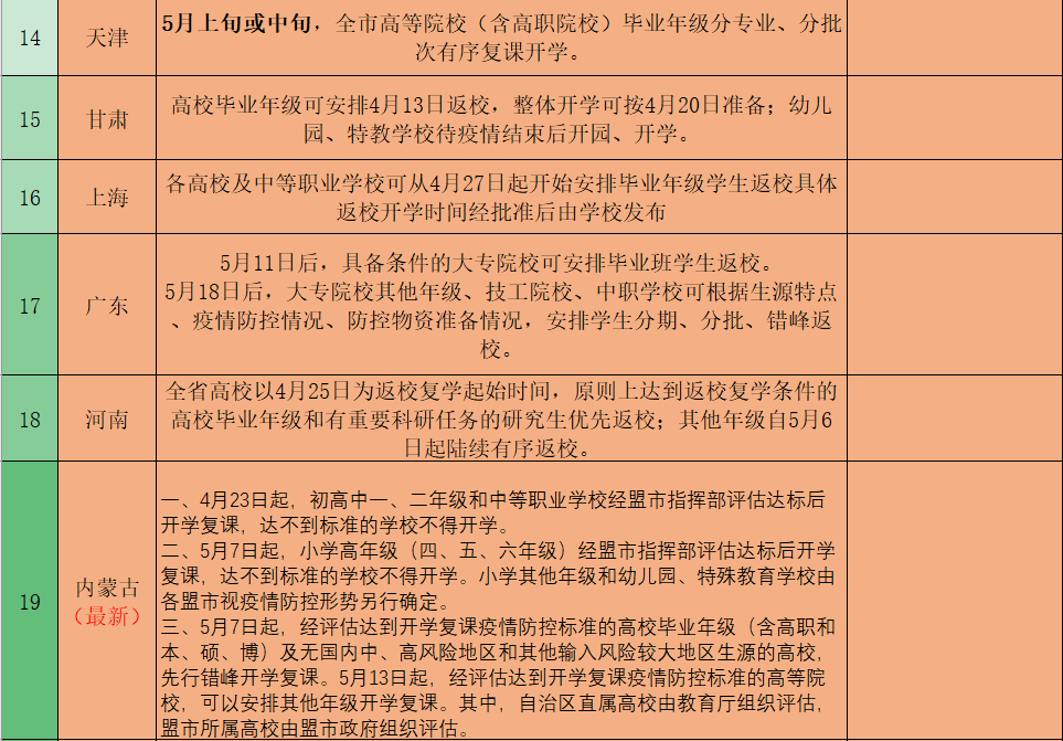 山西发布公告:初中、高中非毕业年级按5月11日做开学准备;小学高段(4—6年级)按5月18日做开学准备;普通高校非毕业年级和成人高校所有年级按5月18日做开学准备;小学低段(1—3年级)、幼儿园、特殊教育学校不得早于5月25日。