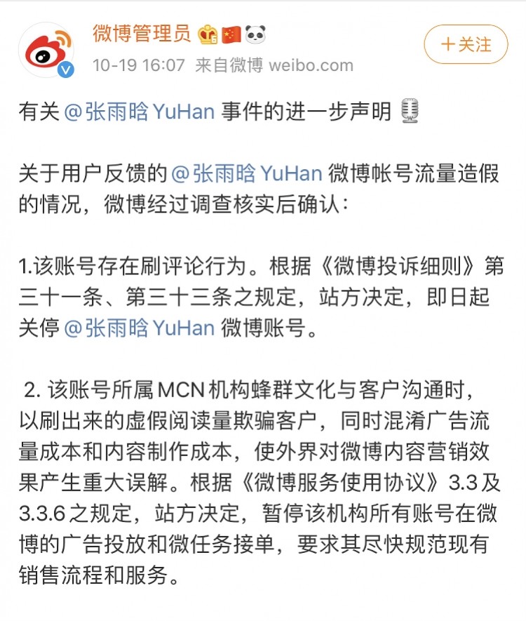 日前,有380万粉丝的微博博主被指刷数据造假一事备受关注。10月19日,新浪微博社区管理发布有关@张雨晗YuHan 事件的进一步声明称,查实该账号存在刷评论行为,将即日起关停该微博账号,并暂停该账号所属MCN机构蜂群文化所有账号在微博的广告投放和微任务接单。