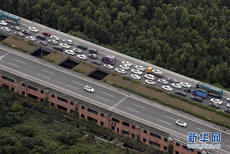 5月1日下午,东莞市麻涌镇,广深沿江高速深圳方向排起车龙(直升机航拍)。新华社记者陈寂 摄