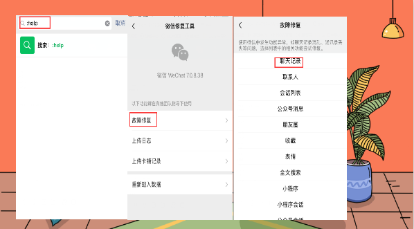 1.使用help恢复的方法 我们直接打开微信点击右上角的+选择添加朋友在搜索栏里面直接输入:help(一定要在英文状态下输入哦,)点开之后选择故障修复,选择你要恢复的聊天记录的选项,然后在微信团队的引导下进行修复。