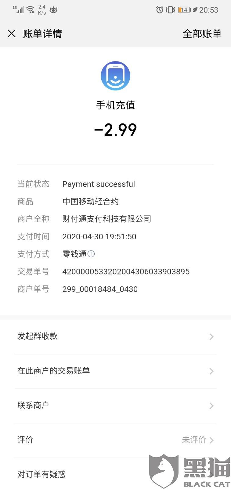 消费者“匿名”在4月30日向黑猫投诉平台反映:“微信充话费时推荐一个轻合约业务,办理的时候是2.99元,办理完一看发现这个业务还附加了一个30元5G流量包,外加一些其他乱七八糟的特权。最让人生气的是这个一开通就是6个月,不允许中途退订,还强制性从话费中扣除这30元。最重要的是开通的时候也没询问你确定是否要订购这个套餐,直接问你要一个验证码付款2.99就开通了这个套餐。这不是蓄意欺骗消费者嘛?希望移动可以重视这个问题,给大家一个交代,不要让消费者伤心。”