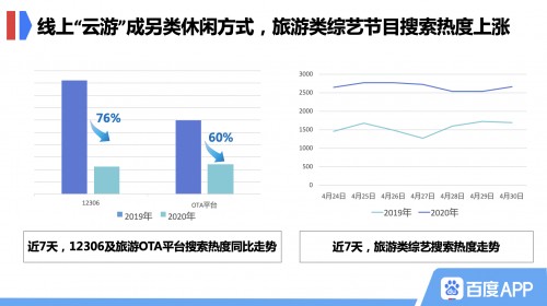 受旅游“大盘遇冷”影响,近7天,“12306”百度搜索热度同比下降76%,旅游OTA平台搜索热度同比下降60%。民众无法长途旅行,但向往远方的心情依然热烈,看旅行节目“云出游”热度上涨。百度搜索大数据显示,近7天,“旅游类综艺”搜索热度同比上涨71%,跟着电视节目“云”游世界,宅家看风景名胜直播也不错。