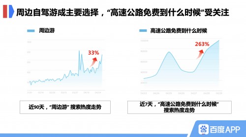 今年五一是十年来最长的五一假期,疫情下出国游、出省游持续降温,周边游反而逆势升温,李兰娟院士此前也表示“五一小长假可以就近出去走走”。近7天,“周边游”搜索热度环比上涨33%。随着“周边游”热度上涨,高速公路是否还免费成网友关心热点,“高速公路免费到什么时候”近7天搜索热度环比上涨263%。