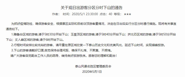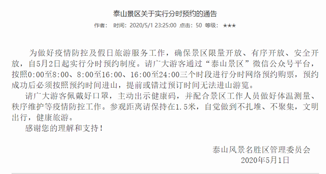 随后,泰山景区官网再发两通告:景区实行分时预约,分时下山。