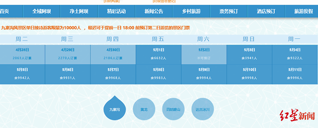 5月1日上午9时,红星新闻记者注意到,九寨沟景区5月2日的网络预售门票已售罄。这意味着今年“五一”期间,九寨沟景区将在5月2日迎来客流高峰。