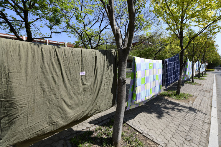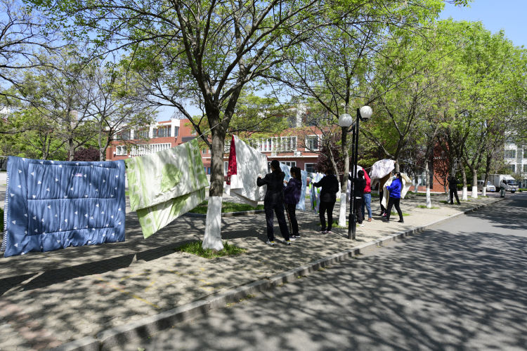 由于学生晾晒被褥的需求量巨大,山科大学生公寓管理服务中心为此采购了标签布条、晾绳等物资。阳光明媚的日子,由宿管阿姨一一做好标记,一床一床的搬到楼下晾晒。