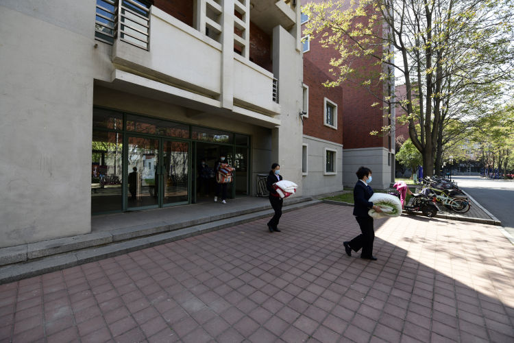 工作人员介绍,4月24日起学校召集学生公寓宿管人员109人紧急返校,全员上岗,集中人员力量,一位位宿管阿姨迅速变身“辛勤的园丁”、“垃圾清运工”、“被子搬运运动达人”,给远在他方的学子提供一对一的暖心服务,让学生感受到“病毒无情,学校有爱”。