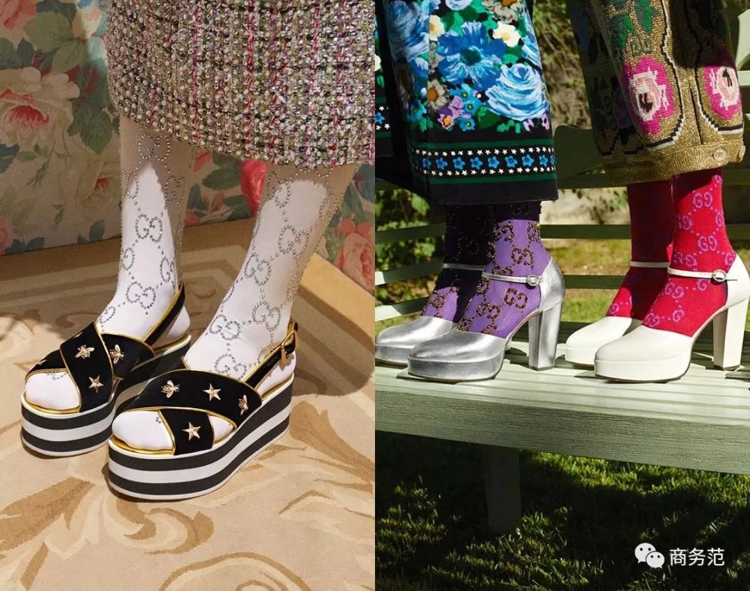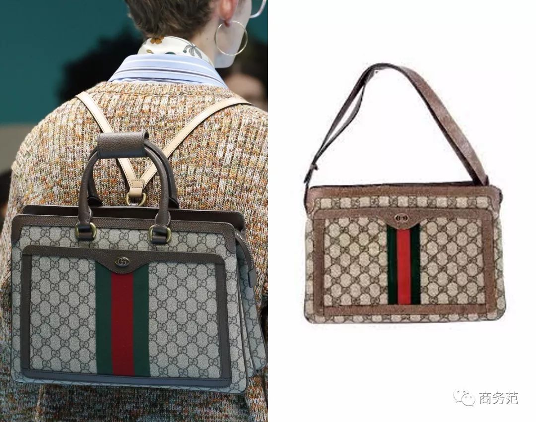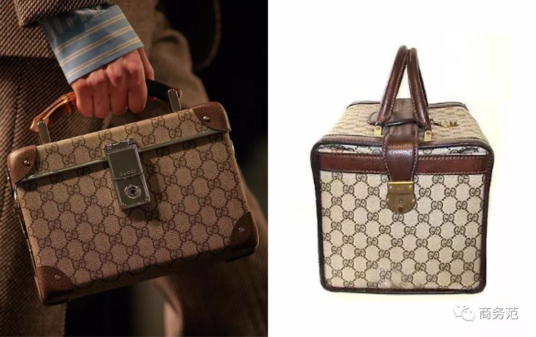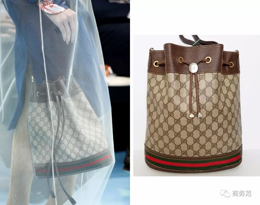 已经上市的2018春夏系列更夸张,个个都像是从过去穿越来的,不信看下面的对比图。(左边是Gucci官网在售新款,右边是十几甚至几十年前的旧款)