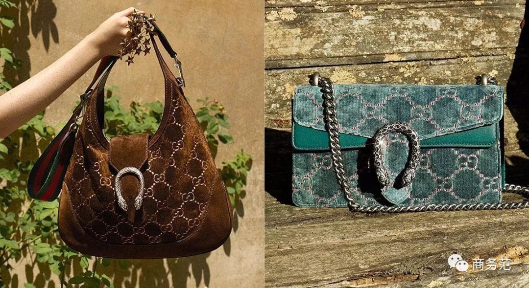除了致敬经典(也可能是设计师偷懒),Gucci在老花上也有一些创新之处,比如与麂皮绒相结合