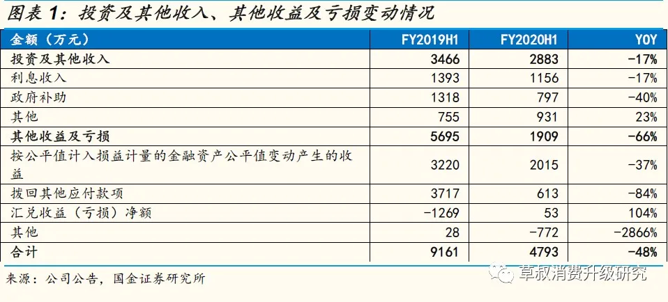 投资及其他收入主要包括银行存款及短期理财产品利息收入、政府补贴投资及物业租金收入等。FY2020H1投资及其他收入同比下降17%至2883万元,其中主要是政府补助同比下降约500万元。