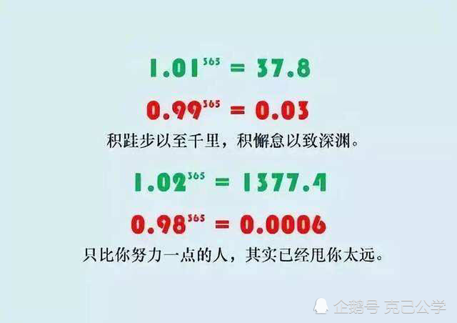 也就是说,如果每天进步1%,一年下来就是接近38倍;如果每天进步2%,那就是惊人的1377倍!反之,如果每天退步1%甚至更多,一年下来所剩无几。“勿以善小而不为,勿以恶小而为之“,“小不忍则乱大谋”,说的就是这个道理。