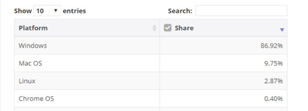 最大受益者是macOS,份额从macOS从8.94%上升到9.75%。Linux的份额从也1.36%上升到2.87%,增幅达到111%,翻了一番还多。