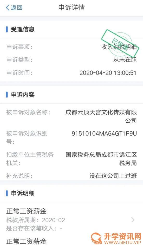 “我是成都艺术职业大学的一名大三学生,通过在个人所得税app上查询得知被一家名为成都云顶动画有限公司的企业盗用身份信息,查询显示,自2019年10月开始就业于该公司并且有薪资被用于申报税款。询问得知,班上几乎所有同学的个人所得税信息上都有被该公司入职并且申报税款的情况。”
