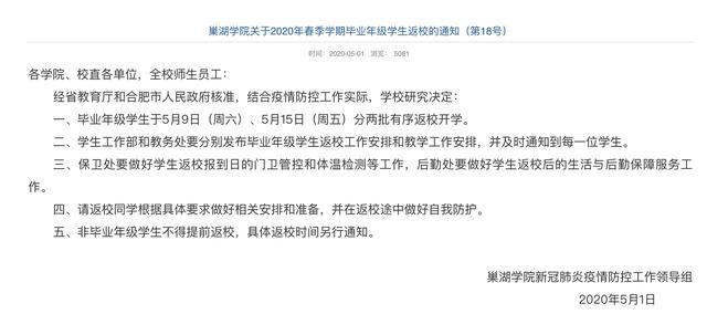 2020年5月8日起启动学生分期分批、错时错峰有序返校。