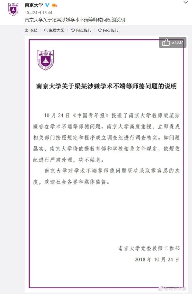 据中青在线10月24日消息,针对南京大学社会学院教授梁莹涉嫌学术不端问题,南京大学社会学院24日下午向记者证实,南京大学校方已正式介入调查,责成有关部门依照程序和规定,一定会有一个结果。对学术不正之风,南京大学不会护短。