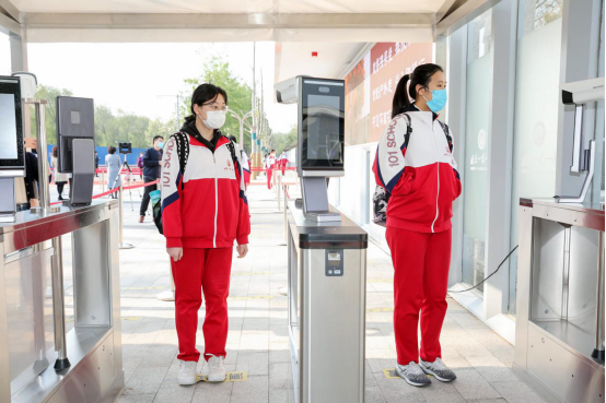 4月27日,北京一零一中复课的高三生在校门口接受红外线测温人脸识别系统体温监测。 北京一零一中供图