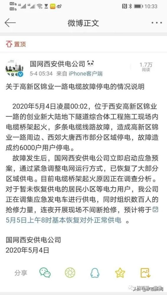 故障发生后,国网西安供电公司立即启动应急预案,通过紧急调整电网运行方式,已恢复了大部分区域供电。目前电缆桥架起火原因正在调查分析。对于暂未恢复供电的居民小区等电力用户,我公司正在调集应急发电车进行供电,同时组织数百人的抢修力量,连夜开展现场不间断抢修,预计将于5月5日上午8时基本恢复对外正常供电。