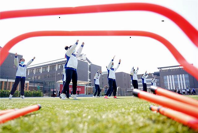 ↑4月27日,北京市丰台区丰台第二中学高三学生正在上体育课。