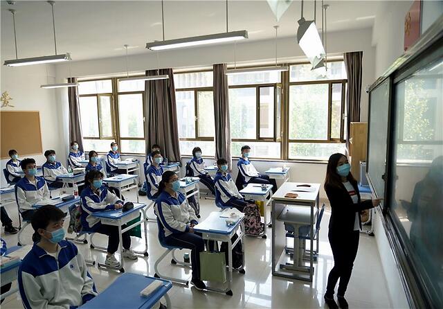 ↑4月27日,北京市丰台区丰台第二中学高三学生正在上课。