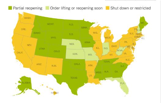 部分重启、即将重启和正在封锁中的州。(截自纽约时报)