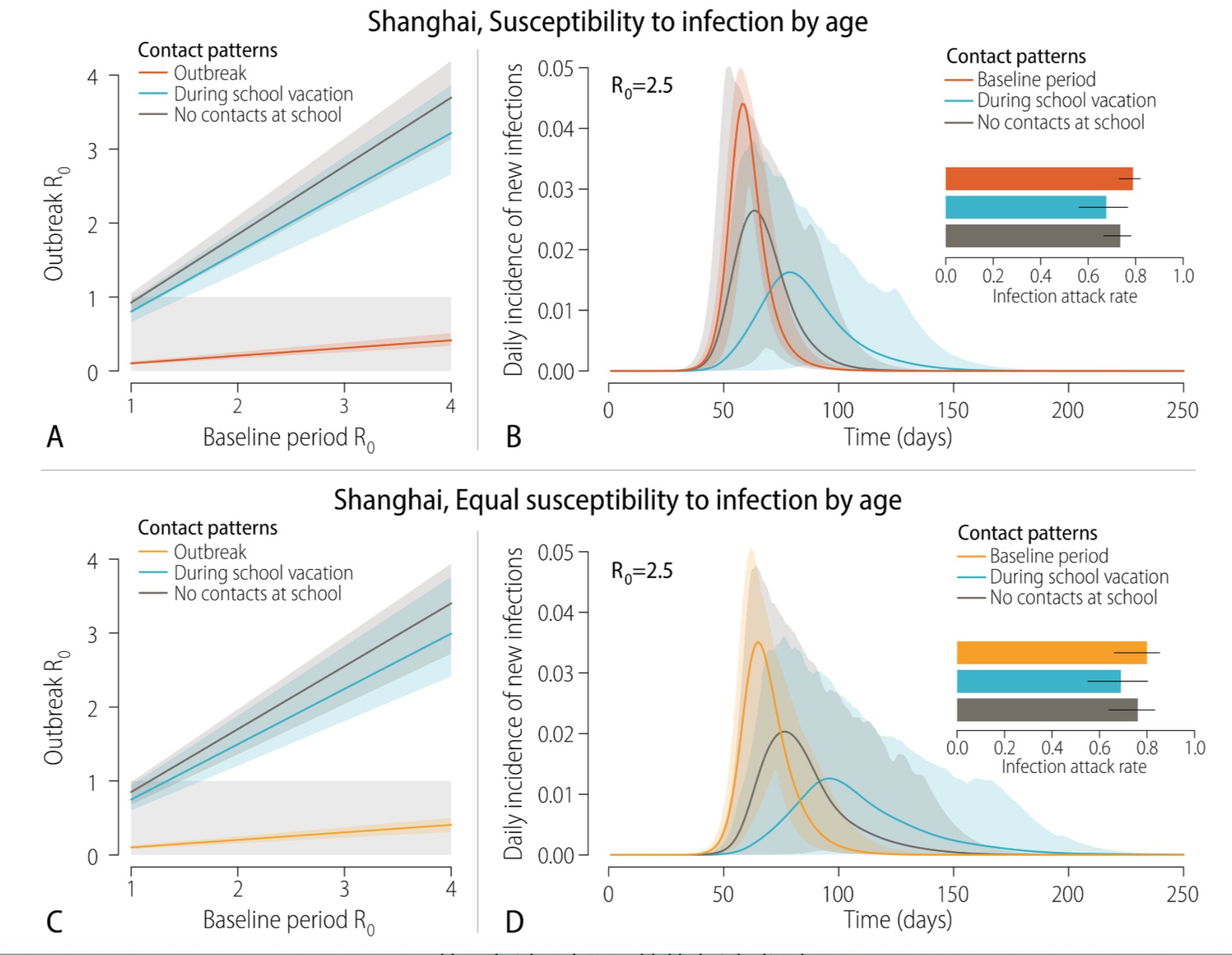 这项研究的建模表明,完全假期接触模式可以阻断基线R0在1.5以内的传播 (图3、A和C) ,正常工作日移除学校接触的模式可以阻断基线R0在1.2以内的传播。举例来说,如果基线R0为2.5,假设在完全假期接触模式下,平均峰值日发病率会减少64%。在正常工作日移除学校接触的模式下,平均峰值日发病率则减少42%。