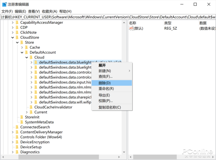 计算机\HKEY_CURRENT_USER\SOFTWARE\Microsoft\Windows\CurrentVersion\CloudStore\Store\DefaultAccount\Cloud