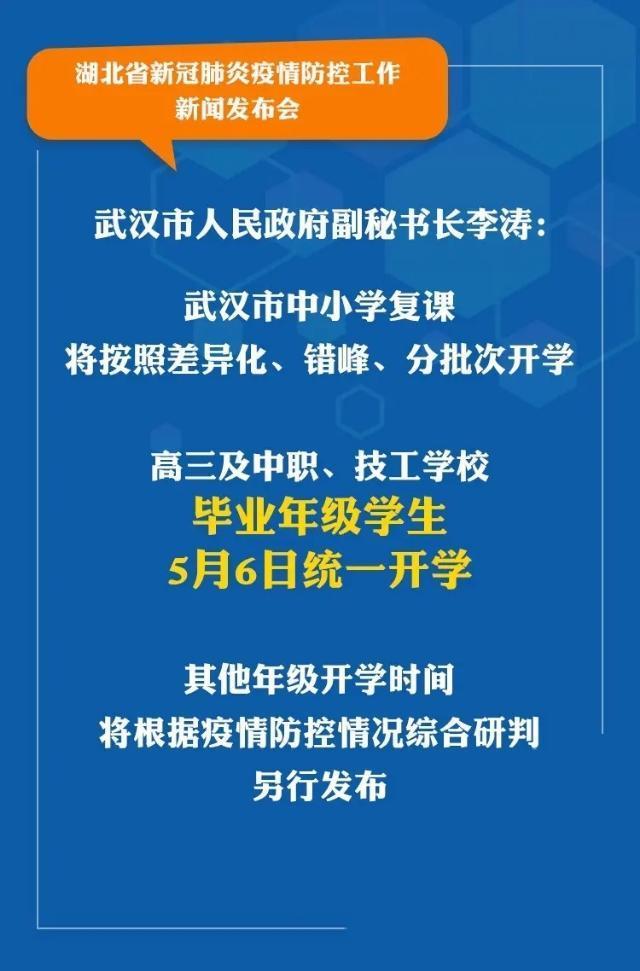 今天湖北省的新一次发布会也发布了一些相关的开学情况,可以参考。按照这个进行推算,预估湖北省的初三年级的开学时间可能为5月11日,中学其他年级可能在5月20日左右。小学可能在5月底,部分大学可能选择不开学!