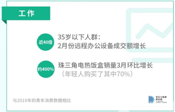 在对全国多个城市的办公用品消费追踪调查中发现,主要城市的大规模复工始于2月上旬,当时主要以远程办公为主,因此2月会议音频视频相关设备成交额同比增长近15倍,而35岁以下人群的成交额增长则达到近40倍;3月份之后增速逐步平稳,但年轻人群依然对办公用品有较强的需求,其中外设产品(键鼠、摄像头、耳麦等)成交额同比增长54%,路由器等网络产品成交额同比增长57%。