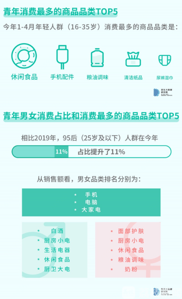 在纪念五四运动101周年暨五四青年节来临之际,京东大数据研究院发布2020青年消费数据,从消费行为来看疫情以来年轻人们的消费变化与趋势,可以发现非常可喜的变化:疫情爆发至今,年轻人的精神追求、工作状态十分良好;家庭责任感增强,是家庭民生必需品的购买主力;另外,白日放歌须纵酒这届年轻人工作猛,也很会玩,95后更会玩。