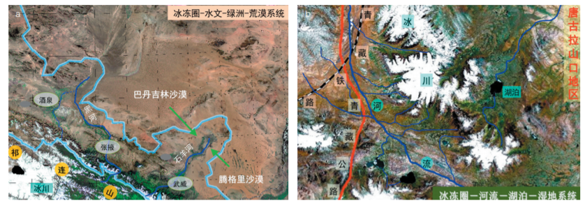 在高纬度及高海拔地区,冰冻圈变化除直接影响一些大江大河源区的水文情势外,还与湖泊消长、沼泽湿地变化有密切联系。冰川变化影响周围地区的水循环过程,进而又影响到源区生态与环境。多年冻土活动层特殊的水热交换是维持高寒生态系统稳定的关键所在,冻土区的高寒沼泽湿地和高寒草甸生态系统具有显著的水源涵养功能,是稳定江河源区水循环与河川径流的重要因素。冻土变化是导致江河源区高寒草甸与沼泽湿地大面积退化的主要原因。总之,在高海拔、高纬度地区,冰冻圈―河流―湖泊―湿地紧密相连,在干旱区内陆河流域,冰冻圈―河流―绿洲―尾闾湖泊―荒漠不可分割,冰冻圈变化对寒区生态系统具有牵一发而动全身的作用。中国西部生态建设与水源保护重大工程,如“三江源”国家公园、塔里木河综合治理工程、西藏生态屏障工程、祁连山生态保护工程及天山自然保护区等均与冰冻圈水文影响息息相关。