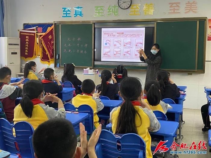 在开学第一课上,该校四年级三班的贾小花老师带领学生们唱着用《生日快乐歌》改编的《洗手歌》配合着七部洗手法,用快乐的方式教会学生们如何正确洗手。随后,班级里提前录制的短视频播放出的国歌,学生全体集体起立敬少先队礼,举行了升旗仪式。