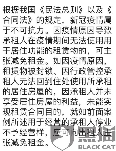 消费者“匿名”在2月6日向黑猫投诉平台反映:“因为疫情问题,本人一直未能回京,目前自家小区都被封锁,回京时间待定,这些都属于不可抗力。希望减免二月房租。 根据我国《民法总则》以及《合同法》的规定,新冠疫情属于不可抗力。因疫情原因导致承租人在疫情期间无法使用用于居住功能的租赁物的,可主张减免租金。如因疫情原因,租赁物被封锁、因行政管控承租人无法回到住处使用所承租的居住房屋的,因承租人并未享受居住房屋的利益,未能实现租赁合同目的,就如前面案例所述用于经营的承租人停业不予经营样,应可向出租人主张减免租金。租客是有权利主张减免的。”