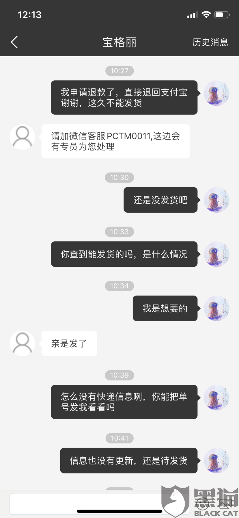 消费者“匿名”在5月5日向黑猫投诉平台反映:“商品一直没有发货,客服说发货了,找不到快递单号信息,要我加售后客服微信处理退款事宜,加了3遍都不理人,发信息客服也不理人了!”