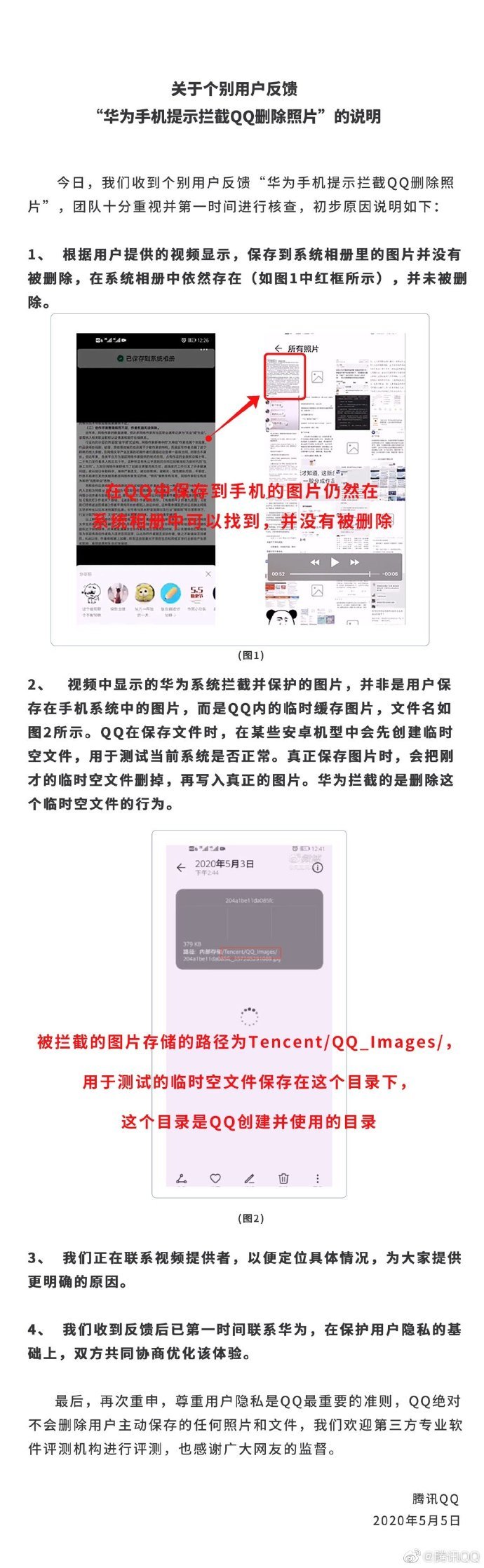 原标题:腾讯QQ回应“华为手机提示拦截QQ删除照片”:是临时缓存图片,相册图片未被删除